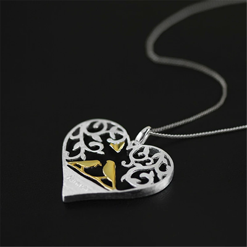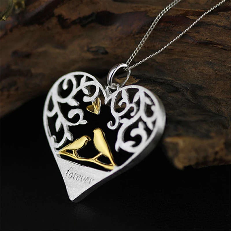 Lotus Fun Real 925 Sterling Silver Handmade Fine Jewelry Romantic Bird in Love Heart Shape Pendant