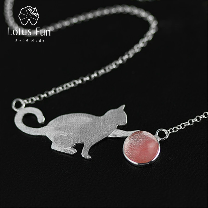 BEST QUALITY Lotus Fun Real 925 Sterling Silver Natural Stone Handmade Fine Jewelry Playing Cat Necklace with Pe